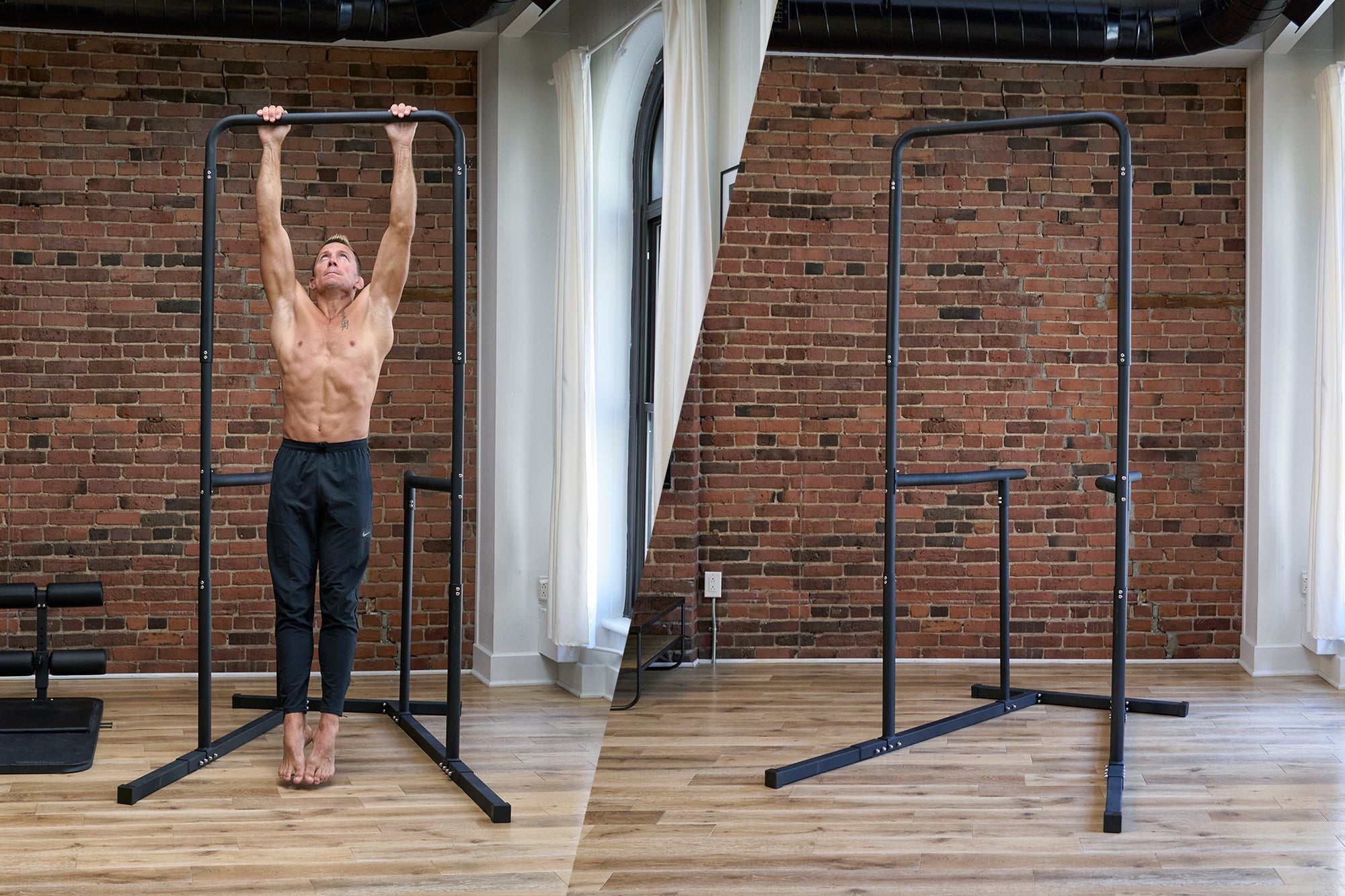 Our tallest pull-up bar with no cross bar to restrict your movement (89” high and 34” wide). Designed for our tallest users to perform dead hang pull-ups, levers and German hangs. Ring friendly.