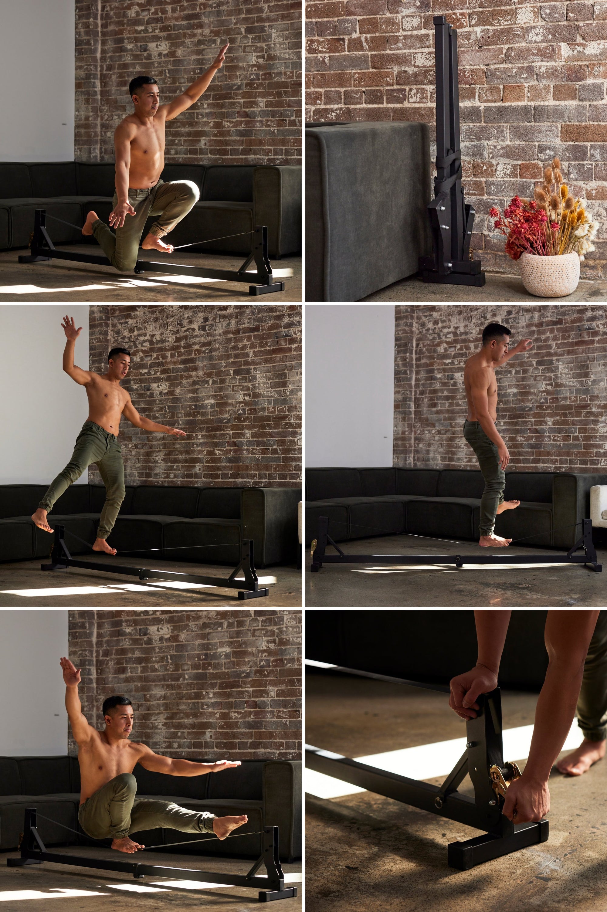 Simple setup - unfold the base and set the tension of your slackline. Walk, turn, lunge, and squat in your living room.